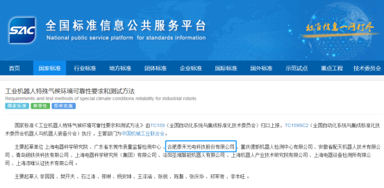 近日,经过网上公示、起草、征求意见、审查、批准,由合肥泰禾光电科技股份有限公司作为主要起草单位(排名前三)起草的国家标准《工业机器人特殊气候环境可靠性要求和测试方法》(标准号:GB/T 39006-2020)于2020年9月29日正式发布,将于2021年4月1日实施。