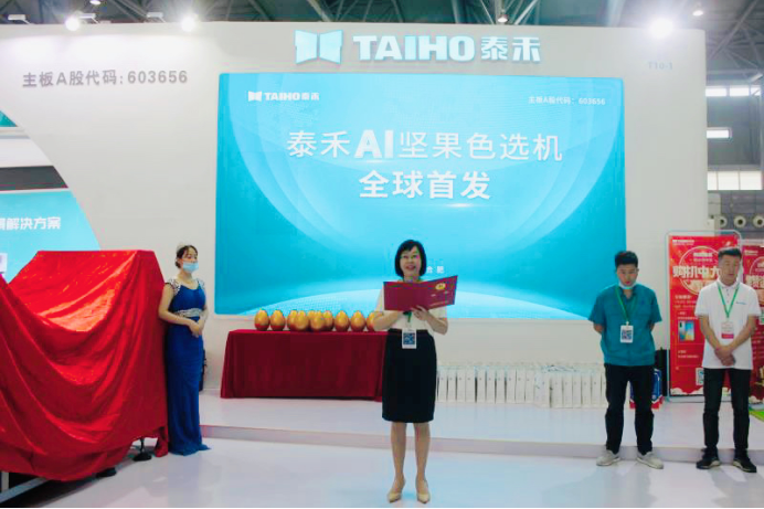 新品发布会上,泰禾光电总裁助理王敏代表公司感谢客户一直以来的支持与信任,并表示此次AI坚果分选机的新品发布,在技术层面将AI+特征算法结合为坚果炒货分选提供了识别和剔除效果,能满足企业对坚果炒货的色选需求。