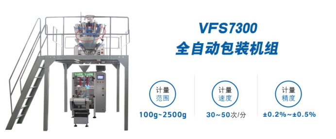 VFS7300全自动包装机组是由VFS7300立式充填包装机、组合秤和输送机组成,集称量、制袋、折边、充填、封口、打印、冲孔、计数于一体,采用伺服电机同步带拉膜,具有自动纠偏功能。