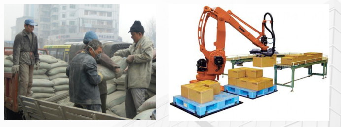 传统的人工搬运码垛,员工劳动强度大,生产效率低,且操作难,培训难,而智能码垛机器人最大的一个优势就是解放劳动力,一台码垛机至少可以代替三四个工人的工作量,提高了劳动效率。