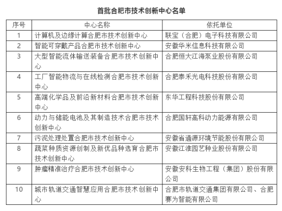 首批市技术创新中心申报达56家,根据科技型企业的综合实力、创新能力等综合评价,择优选择在本行业位居前列的重点企业,最终选定首批10家企业作为合肥市技术创新中心,将着力打造成为省级、国家科技创新基地的“预备队”和全市各类创新基地的“先锋队”。