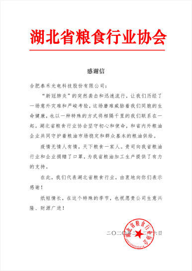 第一批捐赠物资抵达后,湖北省粮食行业协会向泰禾光电发来感谢信,对泰禾光电向湖北省粮油行业和企业捐赠口罩,助力湖北粮油加工生产提供支持,表示感谢。